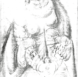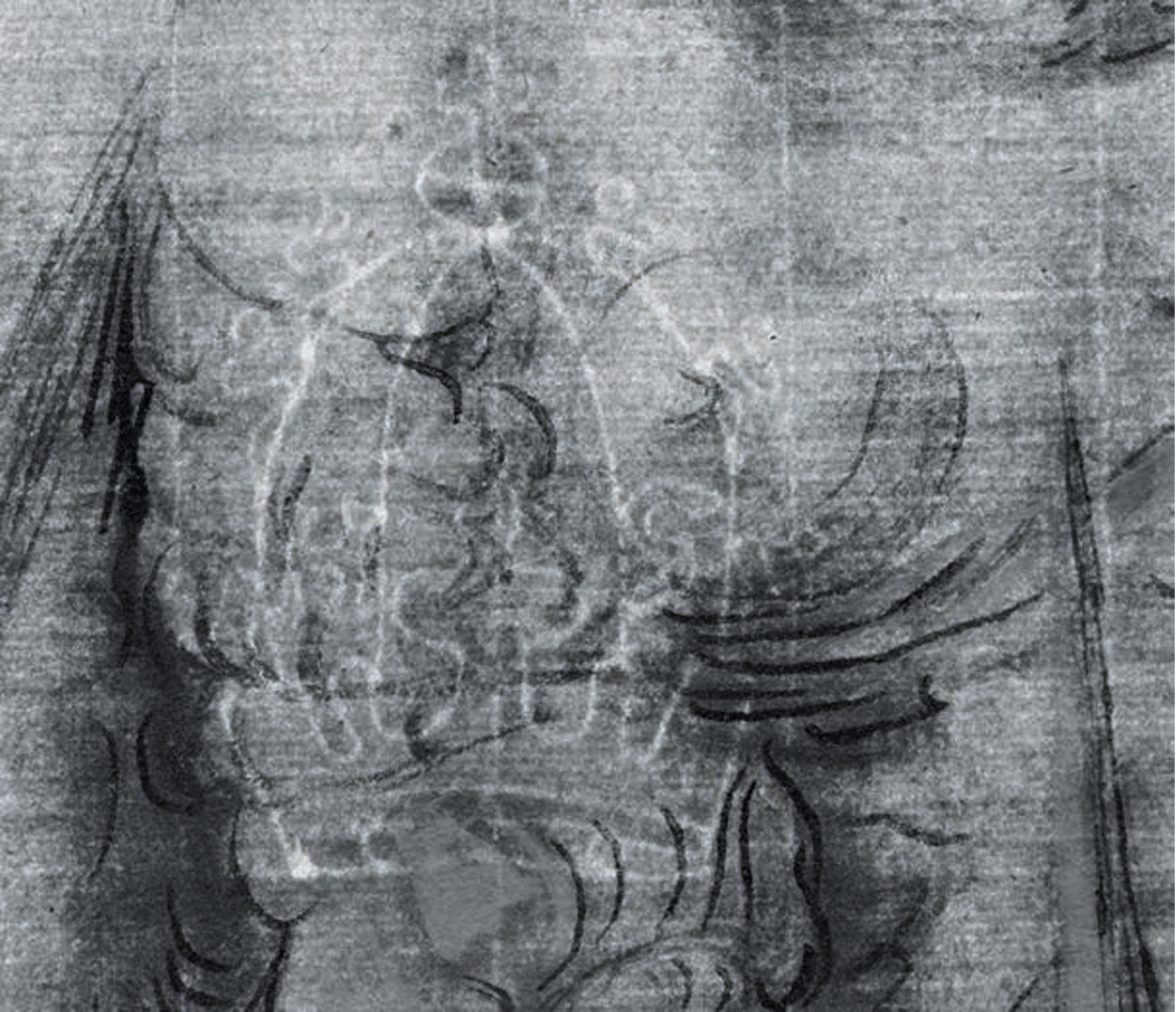 The different levels of the drawing are clearly distinguishable in the IR range. Recognizable auxiliary lines might have been used as perspective tools for copies or scale changes.